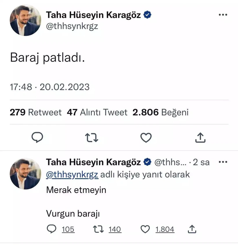 Söz konusu iddiayla birlikte gözler Yenişafak muhabiri Taha Hüseyin Karagöz’ün Twitter hesabından “Baraj patladı” yazılı paylaşımına döndü.