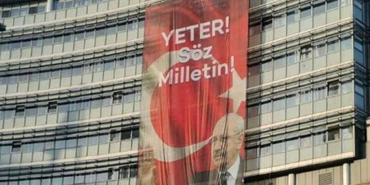CHP Genel Merkez binasına; Kemal Kılıçdaroğlu’nun fotoğrafının ve “Yeter! Söz Milletin!” ifadelerinin yer aldığı dev bir afiş asıldı. Afiş asılan Genel Merkez fotoğrafını, CHP Genel Başkan Başdanışmanı ve İzmir Milletvekili Tuncay Özkan, sosyal medya hesabında paylaştı.
